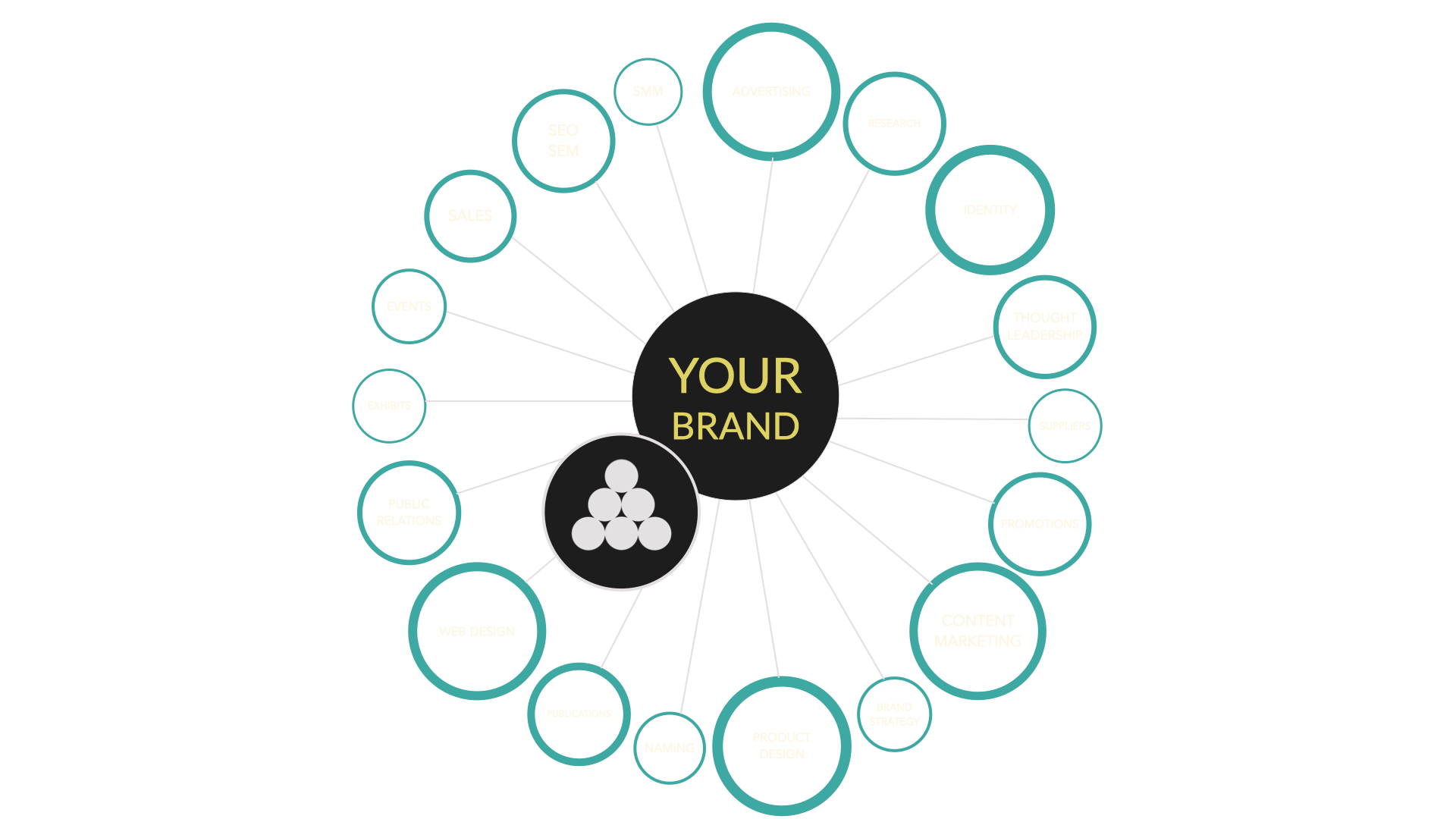 Brand health diagnosis starts with what is working great - these circles represent core functions that are healthy.